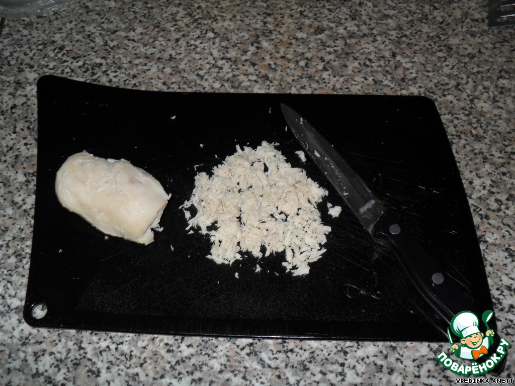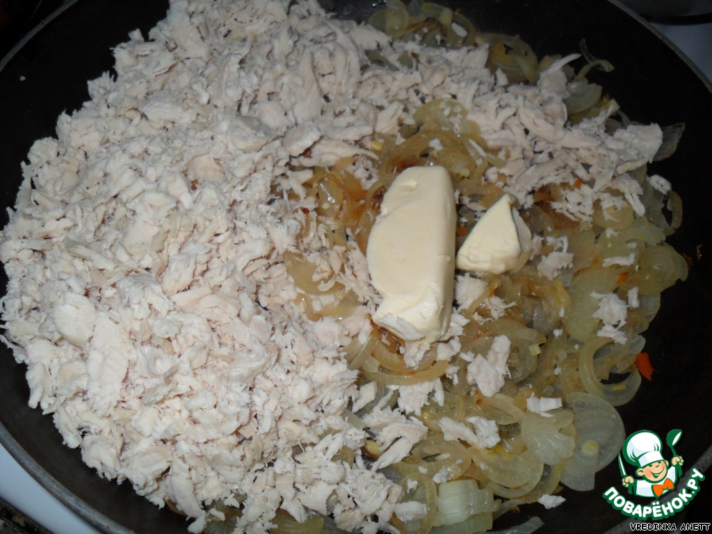 Лук нарезать полукольцами и слегка обжарить, затем добавить к луку нарезанную грудку и обжарить еще 5 минут, посолить и дать остыть.