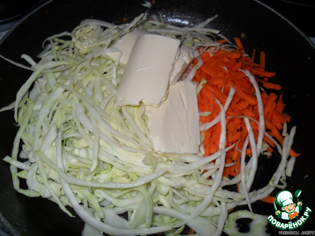 Морковь и капусту потушить на сковороде до момента мягкости капусты и моркови, добавить приправу для корейской моркови по вкусу и дать остыть.