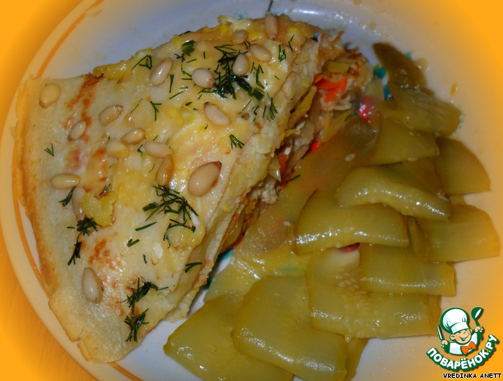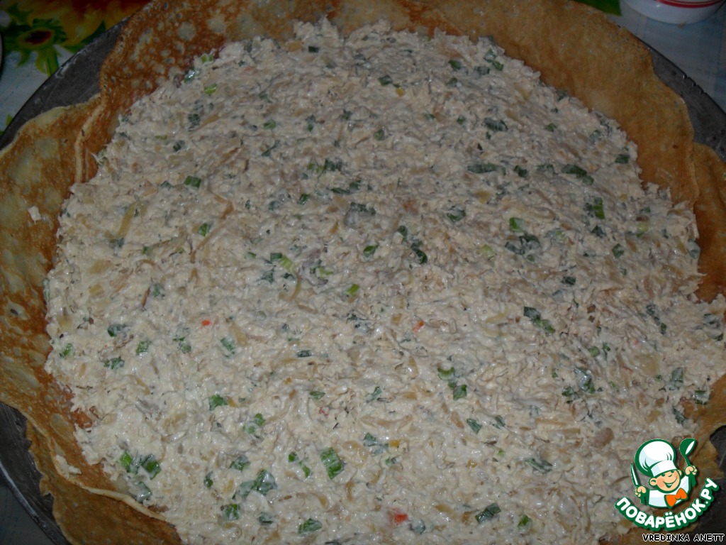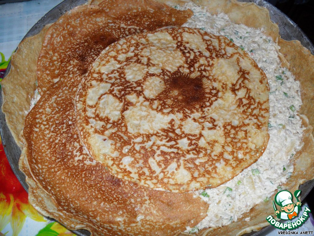 Предлагаю сытный и вкусный блинчатый пирог, который хорошо подойдет на закуску!