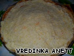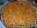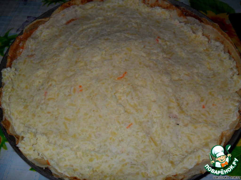 Следующий слой выкладываем из смеси моркови и капусты и покрываем блинчиками.