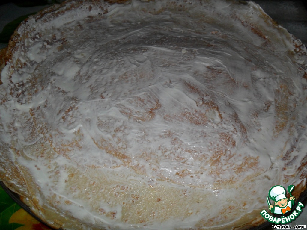 Выкладываем последний слой из блинчиков и промазываем оставшейся сметаной, ставим в разогретую до 180 градусов духовку на 25 минут.