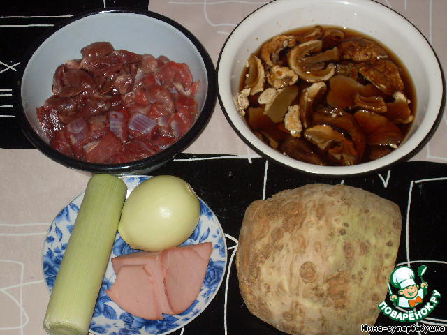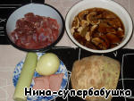 Приготовить продукты. Мясо и потроха промыть и мелко нарезать. Грибы замочить примерно в полулитре теплой воды. Лук очистить.