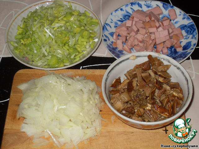 Тем временем нарезать лук и лук-порей, сельдерей и колбасу. Набухшие грибы вынуть из воды (настой сохранить) и тоже нарезать кусочками.