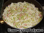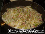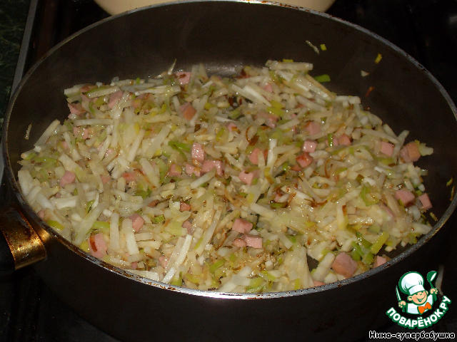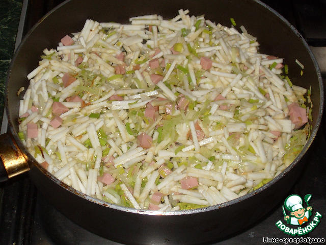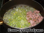 Добавить порей и колбасу.