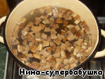 Когда мясо будет готово, добавить в кастрюлю грибы и воду, в которой они вымачивались. Продолжить варку.
