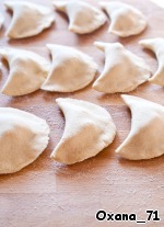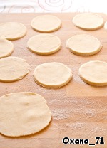 Раскатать тесто не очень тонко, примерно 3-4 мм толщиной. Вырезать круги диаметром 12 см.