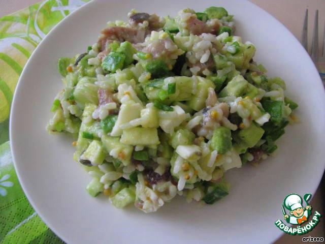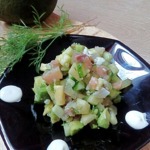 Авокадо (спелое) и яблоко почистить, нарезать кубиками. Филе селедки, свежий огурец, маринованный огурец, белок яйца нарезать мелким кубиком, добавить рис (можно и без риса) и зеленый лук.