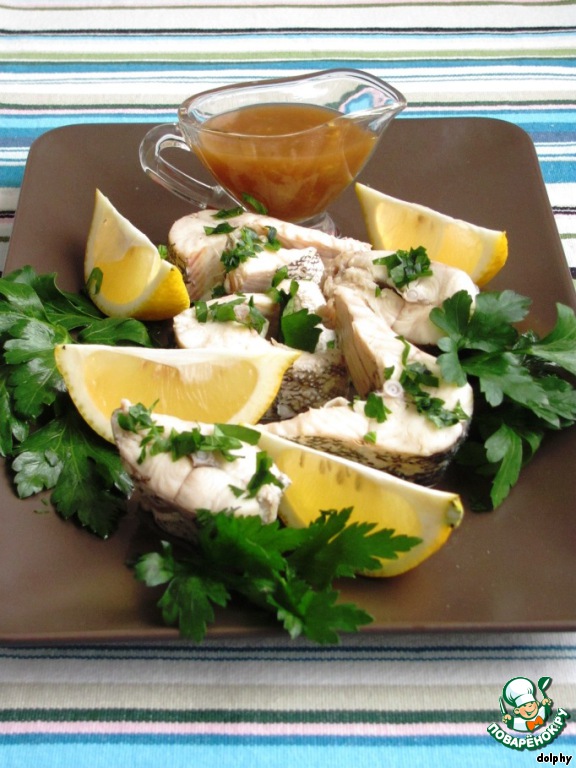 Как вариант горячего блюда подавайте рыбу с соусом и лимоном, посыпав мелко порубленной заленью.