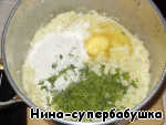 С готового картофеля слить воду, хорошо размять его толкушкой, добавить сырое яйцо, муку и зелень. Хорошо вымешать.