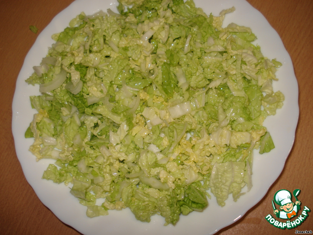 Пекинскую капусту нарезать, лук полукольцами нарезать.