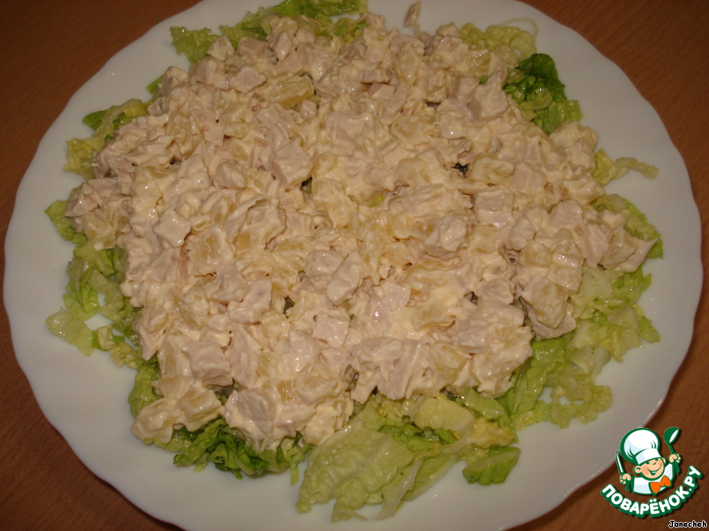 2 слой: ананасы и куриную грудку нарезать кубиками, добавить майонез, перемешать;