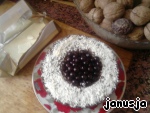 Развожу в воде с сахаром немного желатина, опускаю туда черную смородину, а затем выкладываю в углубление, выставляю ненадолго в холод. Когда желатин «склеит» ягоды, торт готов.