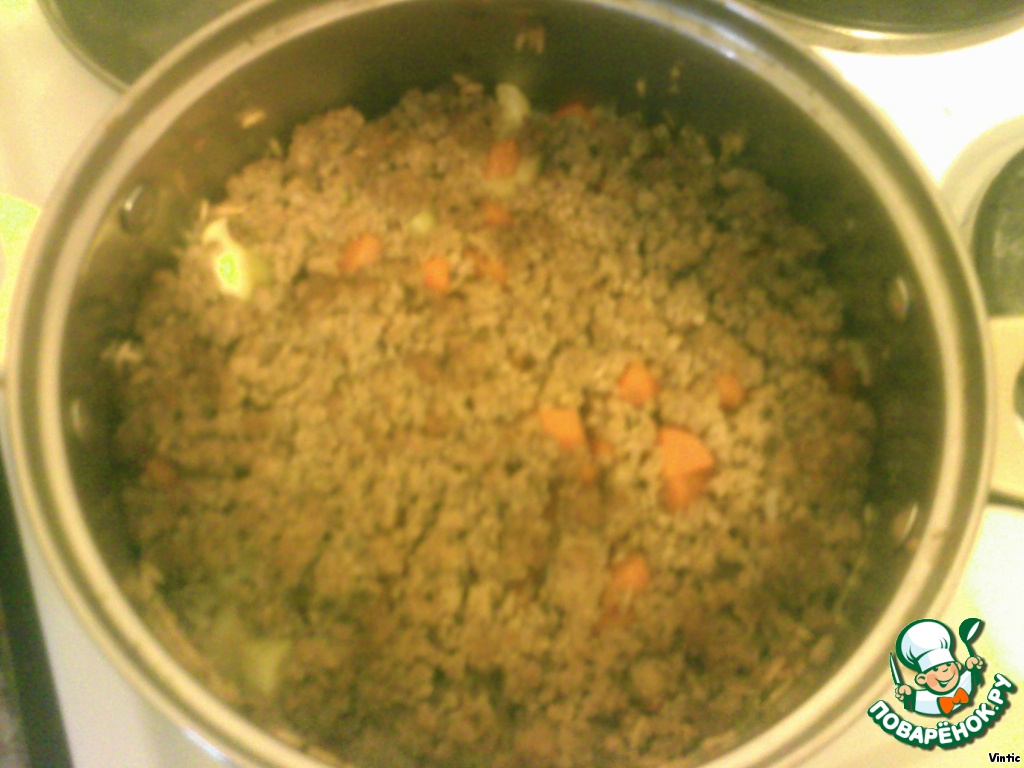 Соединяем фарш с репчатым луком и обжариваем его. Соль и перец добавляем по вкусу.