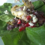 Выкладываем на тарелку салат или листья капусты, далее курицу с овощами, сверху поливаем соусом. Приятного аппетита!