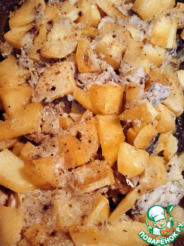 Затем открыть крышку и запечь еще минут 20, чтобы подрумянился верх. Картофель готов.