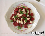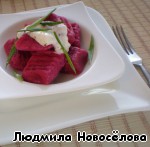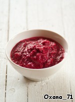 Затем почистить и нарезать кубиками. Очистить одно яблоко и пюрировать вместе с кубиками свеклы в блендере. Если масса немного сухая, то добавить ложку яблочного сока (или свекольного). Выложить пюре в миску, посолить и добавить ложку оливкового масла. -