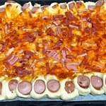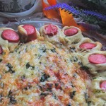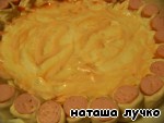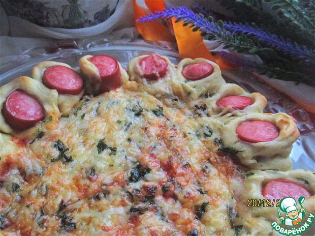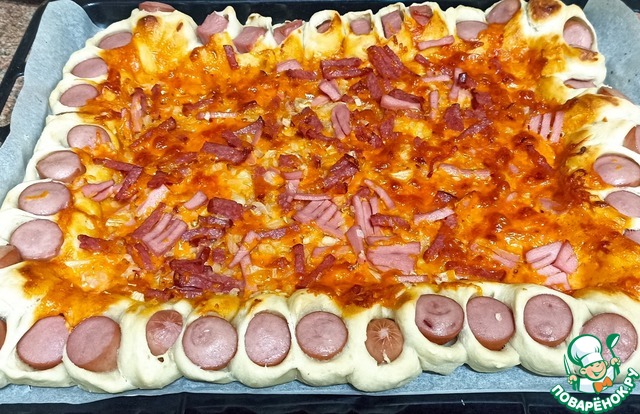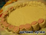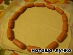 Тесто делим на 2 части: одну пока отложим, а вторую тонко раскатываем, я делаю на пергаменте (позже объясню почему), и по окружности выкладываем сосиски. В моём варианте - много маленьких.