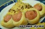 Теперь аккуратно защипываем край, чтобы сосиска оказалась внутри...