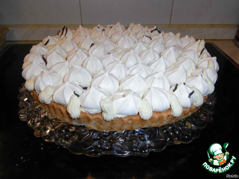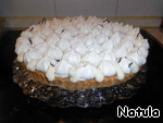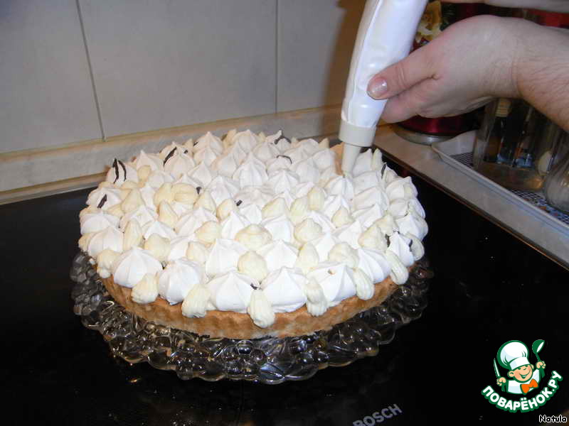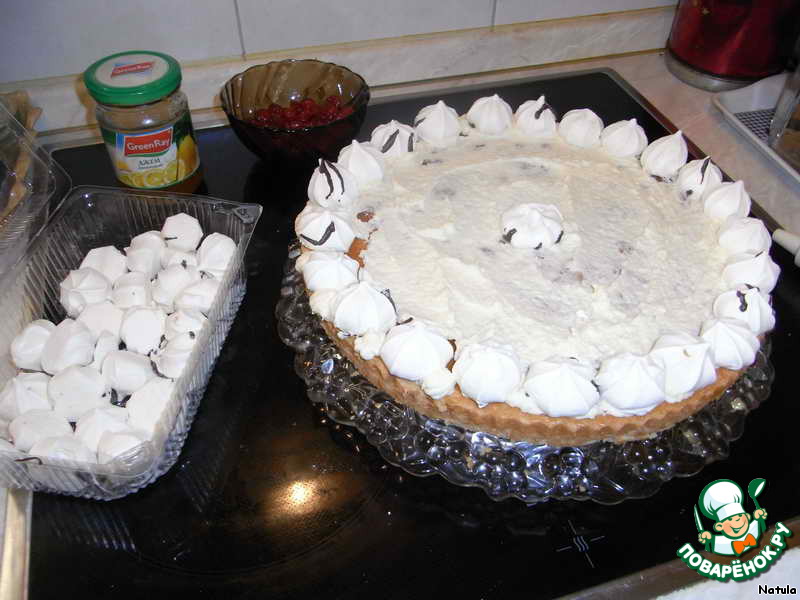 Слегка смазываем кремом корж поверх джема, сверху выкладываем безе.