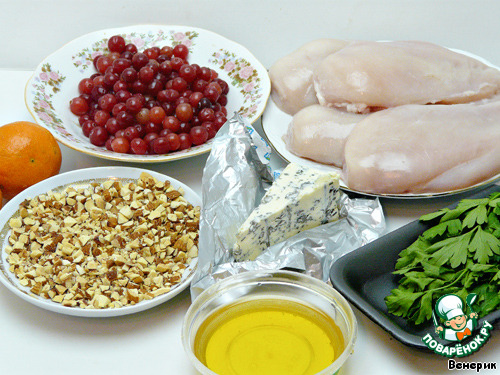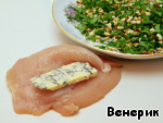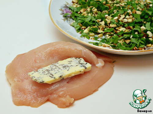 В каждой куриной грудке сделать продольный карман и начинить сыром с голубой плесенью. Для тех, кто не любит такой сыр - можете взять любой твёрдый, например, Чеддер. -