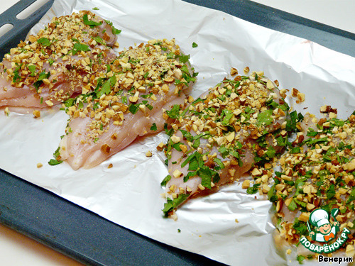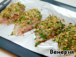 Орехи нарубить, смешать с петрушкой. Запанировать в этой смеси грудки, положить их на лист, застеленный фольгой и сбрызнуть сверху оливковым маслом.