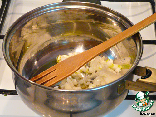 Разогреть в ковшике 1 ст. л. оливкового масла. Обжарить в нём мелко нарезанный репчатый лук, минут пять. -