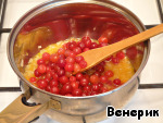 Добавить клюкву, мёд, вино, сок и цедру мандарина (апельсина).