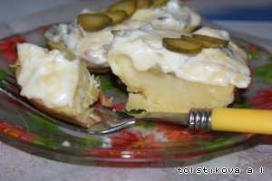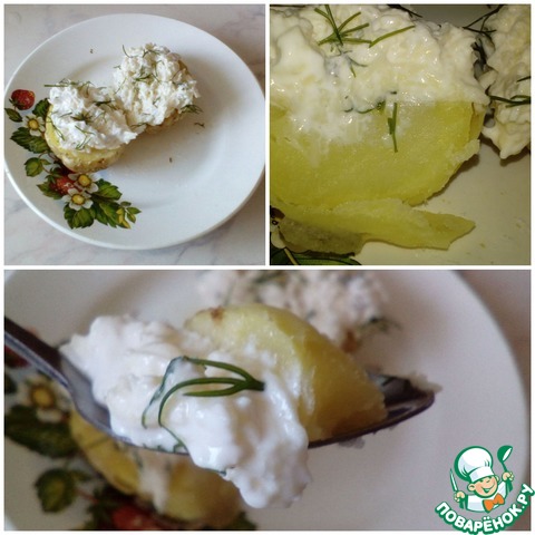 Когда картофель готов, осторожно разрезаем каждый клубень на две части, намазываем приготовленной пастой и отправляем опять в микроволновку на 1 мин., чтобы сыр расплавился! -