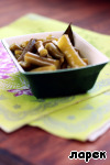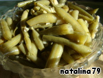 Здесь во Франции очень часто подают зеленую фасоль в качестве гарнира. Я раньше никогда ее не ела, а сейчас очень ее люблю, так как она очень полезна, в ней минимум калорий; в общем, отличное дополнение к мясному или рыбному блюду. Ее можно просто отварить, а можно сделать такое блюдо. Чем-то похоже на консервированную стручковую фасоль, но приготовленная дома, а значит, она полезнее и вкуснее. Рецепт этого блюда был размещен на сайте в 2008 году пользователем elena_110 под названием "Маринованная зеленая стручковая фасоль" и иллюстрирован мной в рамках акции «Раскраски».