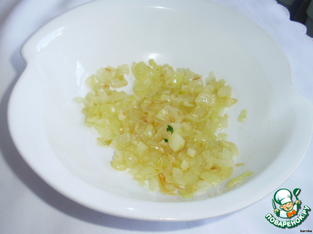 Лук и чеснок порезать кубиками и пассировать на масле со щепоткой сахара до прозрачности. Отставить в сторону остывать.