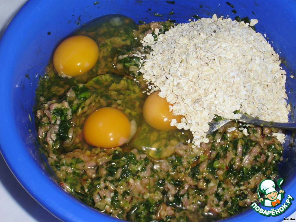 Добавить яйца и овсяные хлопья.