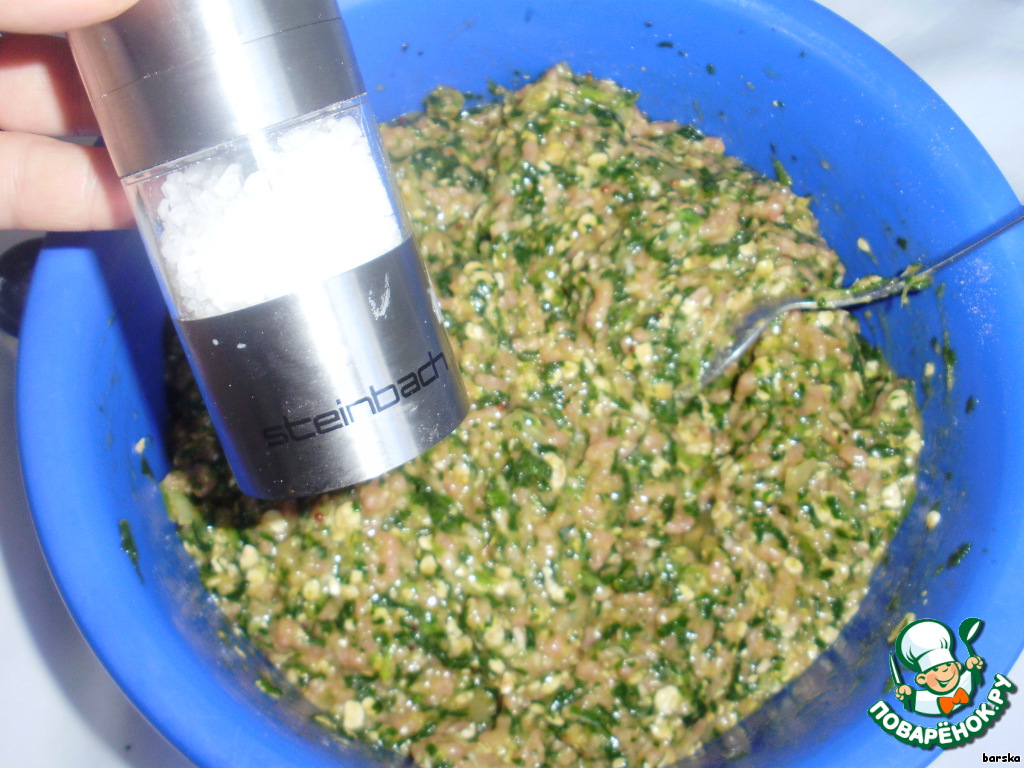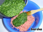 Соединить фарш и размороженный шпинат (лишнюю жидкость предварительно слить).