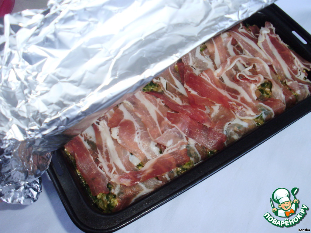 Вылить фарш в форму для кекса и закрыть беконом.
