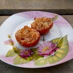 На каждый помидор положить по полной столовой ложке хлебной смеси, в общем, сколько удастся поместить. Запекать в предварительно разогретой духовке (220*С) 15-20 минут, следите за тем, чтобы крошки зарумянились, но не подгорели. Помидоры станут горячими, но не размягчатся.