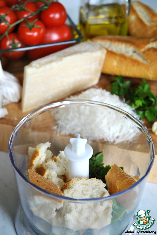 Чеснок, травы и хлеб измельчить в процессоре до состояния не слишком мелких крошек. Чеснок лучше пропустить через пресс или измельчить еще до добавления хлеба, иначе будут попадаться довольно крупные куски.