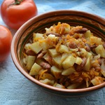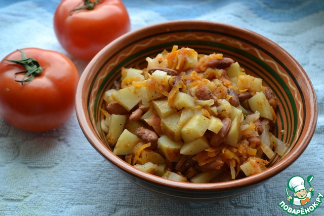 3. Добавляем картофель и фасоль, заливаем томатом (у меня домашний томатный сок с мелконарезанным перцем, а можно даже томатную пасту развести водой или кетчуп).
