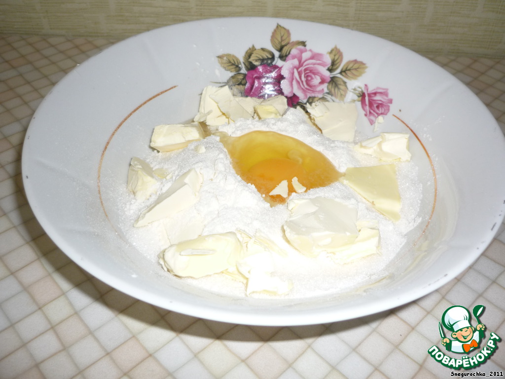 Из просеянной муки, 1 яйца, 100г сахара и 125г масла или маргарина замесить тесто. Завернуть его в пленку и убрать в холодильник на 2 часа.