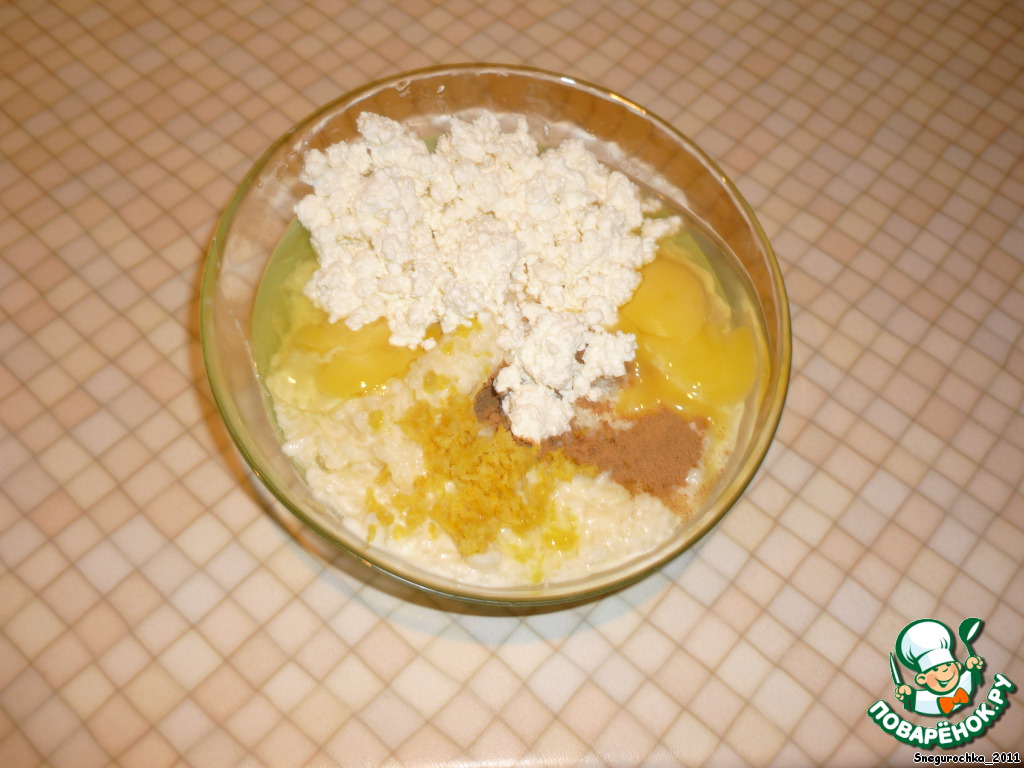 В остывшую кашку добавить творог, 4 яйца, цедру лимона, корицу.