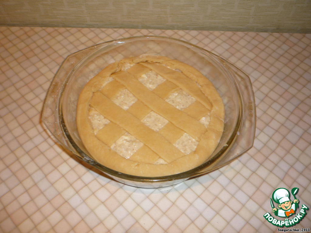 Оставшееся тесто тонко раскатать, нарезать полосками и положить в виде решетки на начинку.