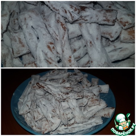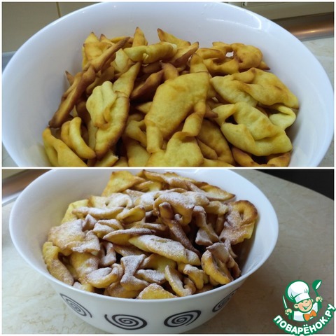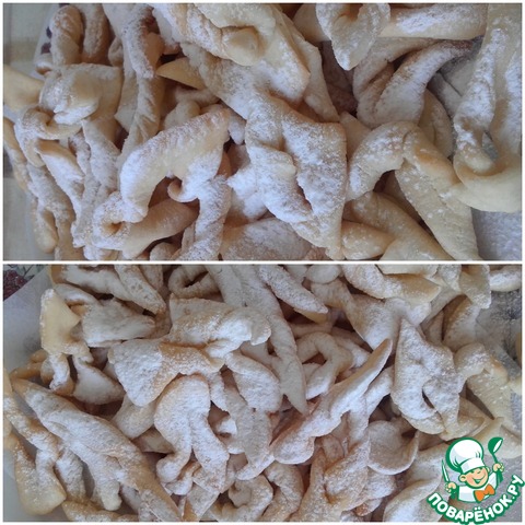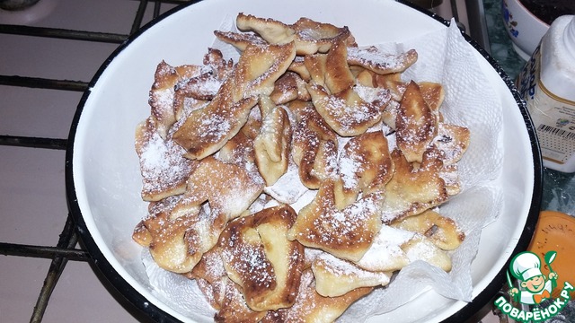 Хворост получается просто бесподобный – нежный, легкий, воздушный, хрустящий. Добросовестно пересмотрела все четыре страницы с рецептами этого блюда, но такого, как у меня не оказалось. В отличие от существующих уже на сайте рецептов, дрожжи, сметана, кефир, водка и другие ингредиенты я не использую. На самом деле всe проще простого. Изделия из этого теста не впитывают масло при жарке.