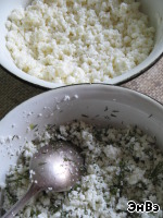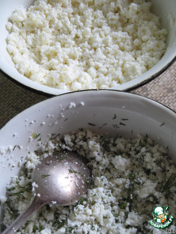 Пока картофель варится, приготовим начинку. Тщательно растираем брынзу. Я разделила начинку на две части и к одной добавила укроп. Забегая вперед скажу, что можно добавить в сыр любые пряности или зелень, которые вам по душе, т.к. результат оказался положительным.