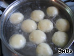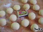 Кусочки скатываем в шарики и расплющиваем их в лепешки, на каждую чайной ложкой выкладываем начинку, осторожно соединяем края и стараемся придать кнелям форму шара (это совсем не сложно, тесто легко принимает любую форму).