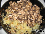 Лук режем кубиками и жарим на смеси 1 ст. л. сливочного и 2-3 растительного масла. К готовому луку добавляем грибы и жарим еще три минуты.