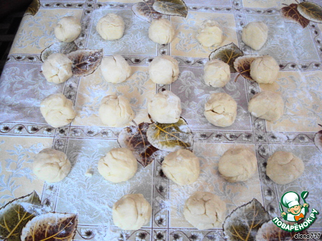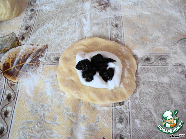 Каждый шарик раскатать или размять рукой на столе, в центр положить по маленькой ложке крема и чернослива.