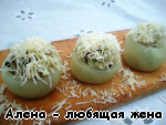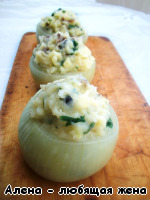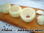 Приступим к "корзинкам": луковицу почистить, срезать донышко немного, чтобы луковица стояла, не падала. Срезать с верхушки примерно треть, с оставшейся части со стороны донышка выдавить лишнее, так поступить со всеми луковицами.