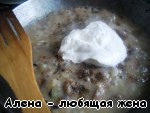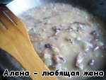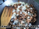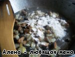 В это время приготовить соус: разогреть грибы с луком, добавить муку, перемешать.