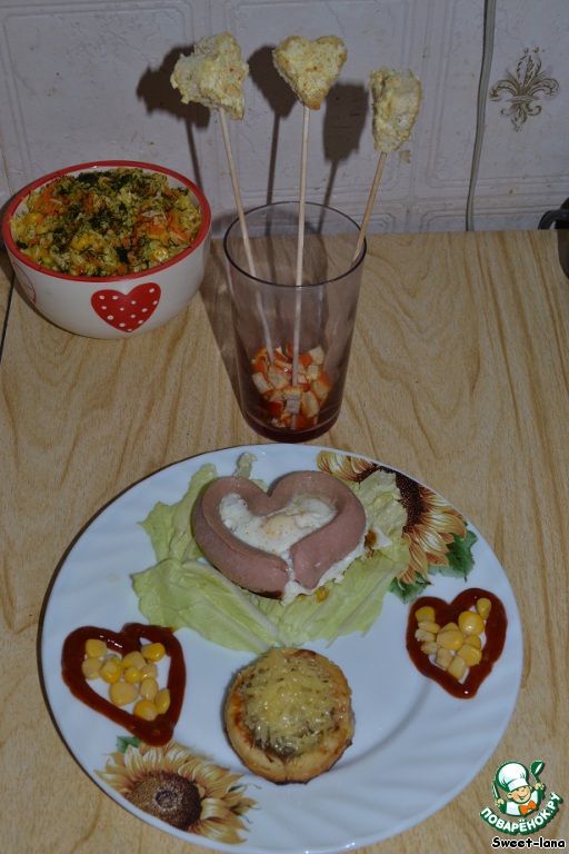 Из хлеба вырезаем сердечки. Намазываем один сырно-паштетной массой и закрываем вторым сердцем. Отправляем в разогретую до 150 градусов духовку на 5-7 минут (хлеб должен немного подрумяниться). Достаем. И пока горячие, вставляем в них палочку, бока обсыпаем смесью укропа и желтка.