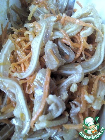 Теперь нужно нарезать ушки на маленькие длинные полоски. Лучше всего это делать ножницами. Гораздо быстрее и удобнее, чем ножом. Тут мне вызвался помочь муж :-).