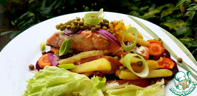 Выложить в форму (сковороду, сотейник, кастрюлю с толстым дном) слой свеклы, морковку, посолить, затем рыбу, в промежутках между рыбой - лук, горошек (можно и без него, я пока брала замороженный), посолить, добавить специи, влить растительное масло, 50 г воды и сметану (если рыба жирная - то сметану взять нежирную или кефир). Накрыть крышкой и в разогретую около 200 градусов духовку на 40 мин.