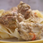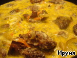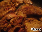 Добавляем соус (который мы приготовили в самом начале), перемешиваем, накрываем крышкой и тушим еще 5 минут. В это время соус, "связываясь" с мукой, загустеет.